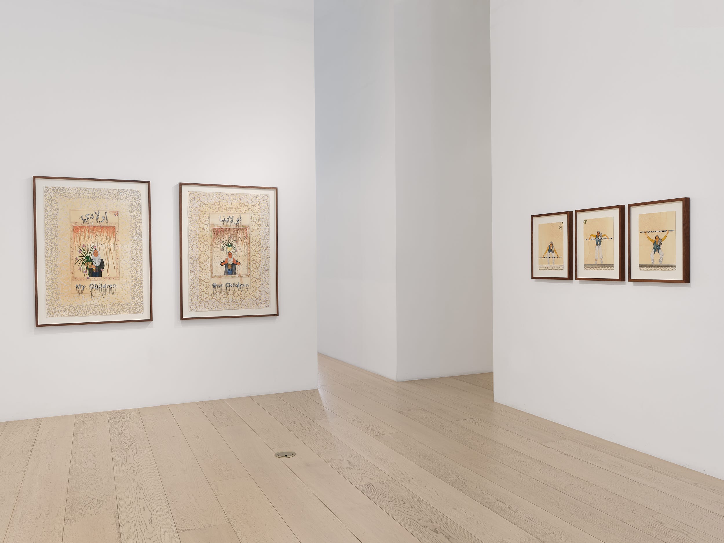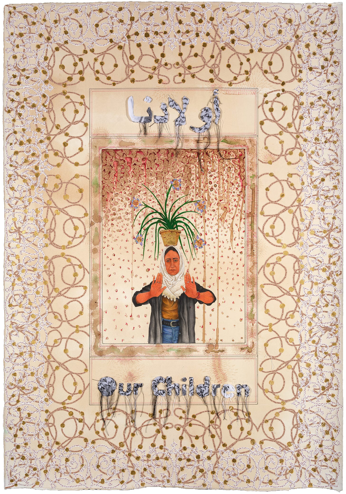 Both pieces in the diptych “Awladi (My Children)” and “Awladna (Our Children)” feature a woman wearing a headscarf and holding a potted plant in her arms and balanced on her head. The plant, which recurs throughout several pieces in “I Bear Witness” is a “walking iris,” a flower that blooms for just half a day and propagates itself via offshoots. In each piece, the title has been woven into the surface with keffiyeh fabric. The female subjects stand in the center of decorative borders, reminiscent of illuminated manuscripts, laced with gold leaf and collaged, printed text. In Awladi (My Children),” the titular text references an online video Butt watched of parents crying out for their children in the aftermath of missile strikes. “Awladna (Our Children)” has been collaged with the text of the 1980 poem, “Lullaby For A Palestinian Child,” by the Pakistani poet Faiz Ahmad Faiz. Applied today, the half-century old poem offers a symbol of the endurance of bearing witness and of artistic modes of protest.