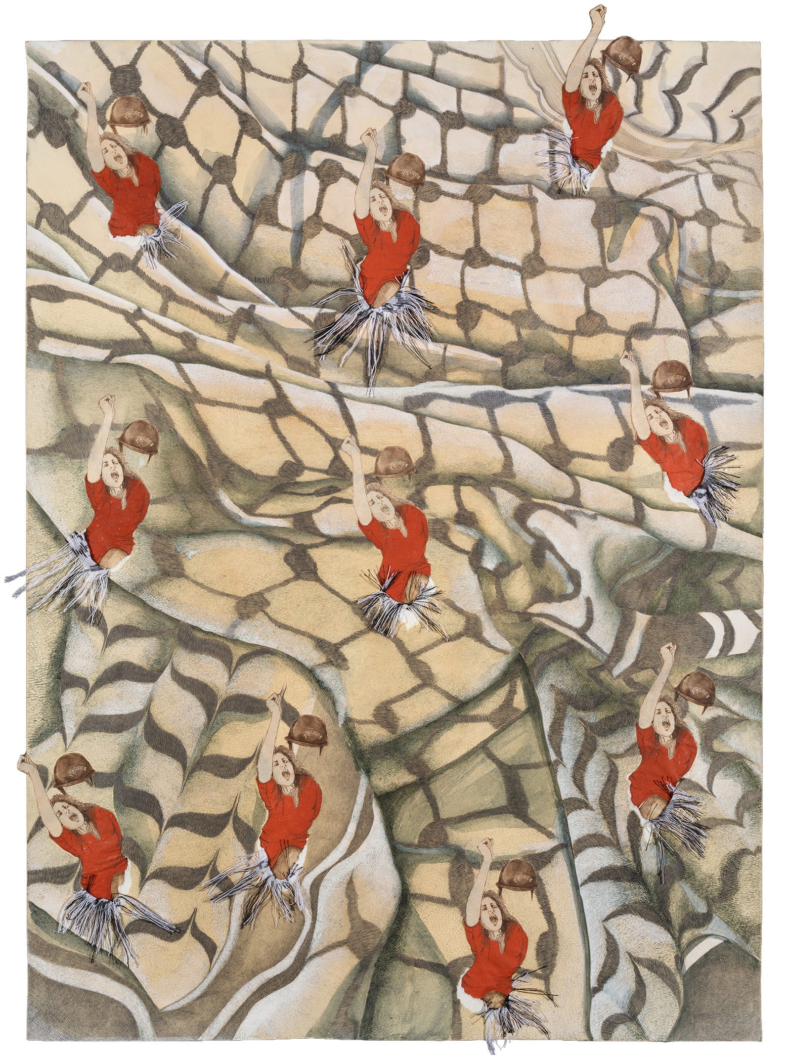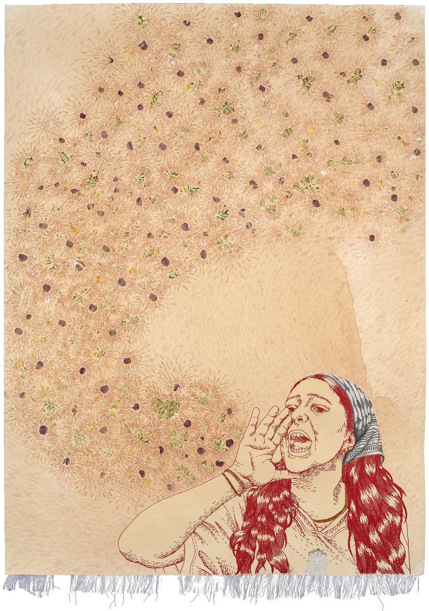 In the related pieces “Speak!” and “Silence!” figures illustrated with red thread stitched into the surface of tea-stained paper offer two counterintuitive moments from scenes of protest. The figure in “Speak!” covers their mouth with a hand, a look of sorrow and frustration in their eyes, at the breaking point of their silence, poised to make themselves heard. Butterflies dance around the figure’s head, signaling the imminent metamorphosis. In “Silence!” a woman wearing a keffiyeh headscarf shouts, a hand cupped to her mouth and a stream of marigolds issuing from her lips, perhaps on the verge of being forcibly silenced. In “Speak!” and “Silence!,” the resonance of both censorship and assertion ring loud, their inverse impacts made tangible. It’s an apt reminder that our choice to speak up matters, too, even if it often feels ineffective and catatonia is the more familiar response.