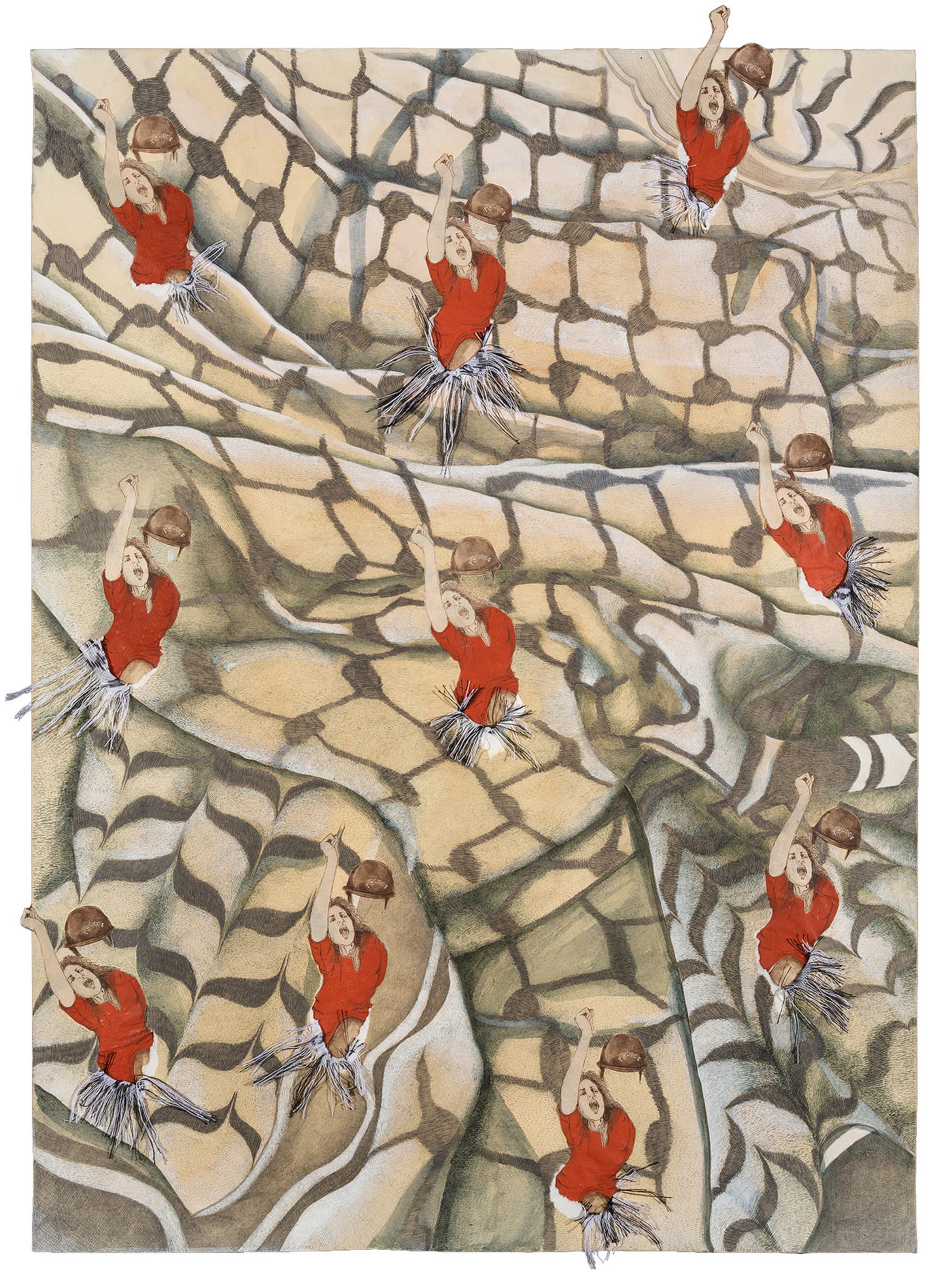 In “Rupture,” we get a familiar character of social media protest culture. The repeated collaged character of a woman raising her fist smashes through the surface of the artwork, which has been illustrated in pencil with the pattern of a keffiyeh. The figure is based on an image taken from a 1980s women’s march in Pakistan — not a contemporary image — though it could be any number of protestors spotted at recent No Kings or anti-ICE rallies. It’s a hopeful reminder that, like the seeming perennialism of the oppressive conditions that birth them, protest movements are undying. But they don’t always make their way into contemporary art spaces.